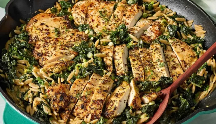 Αυτό το δείπνο σε ένα τηγάνι προσφέρει πρωτεΐνη και γεύση με τρυφερά φιλετάκια κοτόπουλου, ολικής άλεσης κριθαράκι και μαραμένα λαχανικά, σε μια κρεμώδη, λεμονάτη σάλτσα με μυρωδικά. Ο άνηθος και τα φρέσκα κρεμμυδάκια προσθέτουν δροσιά, ενώ ένα πλούσιο, σπιτικό μείγμα μπαχαρικών δίνει ένταση στη γεύση.