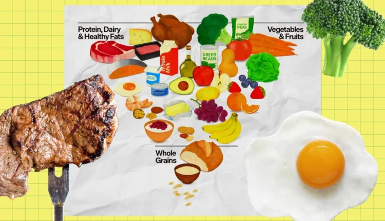 Για αρχή, ας επισημάνουμε το προφανές: είναι ανάποδη. Σύμφωνα με τη νέα διατροφική πυραμίδα, η πρωτεΐνη, τα γαλακτοκομικά και τα υγιή λίπη θα πρέπει να βρίσκονται στο κέντρο κάθε γεύματος, με το infographic στο realfood.gov να αναφέρει: «Κάθε γεύμα πρέπει να δίνει προτεραιότητα στην υψηλής ποιότητας, πλούσια σε θρεπτικά συστατικά πρωτεΐνη τόσο από ζωικές όσο και από φυτικές πηγές, σε συνδυασμό με υγιή λίπη από ολόκληρα τρόφιμα όπως αυγά, θαλασσινά, κρέατα, πλήρη γαλακτοκομικά, ξηρούς καρπούς, σπόρους, ελιές και αβοκάντο.” Ο επίσημος κυβερνητικός ιστότοπος που φιλοξενεί τα DGAs προτείνει έναν “πρωτεϊνικό στόχο” 0,54 έως 0,73 γραμμάρια ανά λίβρα σωματικού βάρους την ημέρα.