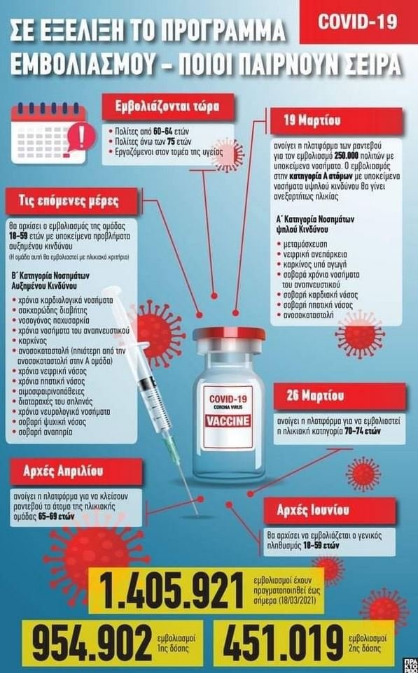 Υπενθυμίζεται ότι τώρα εμβολιάζονται οι πολίτες από 60 έως και 64 ετών, πολίτες άνω των 75 ετών και εργαζόμενοι στον τομέα της υγείας.