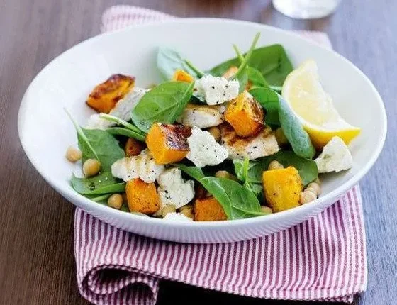• Τοποθετήστε τα ρεβίθια, τη φέτα, το σπανάκι, την κολοκύθα και το κοτόπουλο σε ένα πιάτο και σερβίρετε.