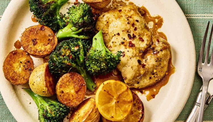 Αυτή η συνταγή για Κοτόπουλο στο Φούρνο με Λεμόνι-Πιπέρι, Μπρόκολο & Πατάτες είναι γρήγορη και εύκολη για τις πολυάσχολες καθημερινές, ενώ είναι αρκετά εκλεπτυσμένη για τους καλεσμένους του Σαββατοκύριακου. Ζουμερά μπούτια κοτόπουλου, πλούσια σε πρωτεΐνη, απορροφούν τη σάλτσα μουστάρδας, σκόρδου, λεμονιού και πιπεριού, η οποία χρησιμεύει επίσης ως επικάλυψη για τα λαχανικά. Οι πατάτες αποκτούν μια χρυσαφένια απόχρωση, ενώ το μπρόκολο αναπτύσσει ένα ελαφρύ κάψιμο από το ψήσιμο, αναδεικνύοντας τη φυσική του γλυκύτητα. Κάθε πιάτο παίρνει ένα ψιλόβρεγμα γρήγορης σάλτσας από λεμόνι, μουστάρδα και ζουμιά του ταψιού, ενώ μια ελαφριά πινελιά από θρυμματισμένο κόκκινο πιπέρι προσθέτει μια προαιρετική τελική νότα θερμότητας. Διαβάστε παρακάτω για τις συμβουλές των ειδικών μας, συμπεριλαμβανομένου του τρόπου για να διασφαλίσετε ότι ψήνετε τα λαχανικά σας και δεν τα ατμίζετε στο φούρνο.