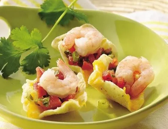 Μίνι τορτίγιας με πικάντικη σάλτσα ντομάτας, τσίλι και γαρίδες