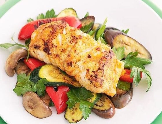 Φιλέτο ψαριού με πικάντικη σαλάτα λαχανικών μπάρμπεκιου
