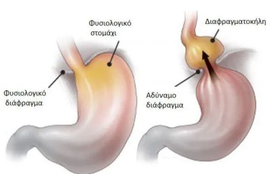 Η διαφραγματοκήλη συμβαίνει όταν ένα τμήμα του στομάχου γλιστρά μέσα από ένα άνοιγμα (διάφραγμα) ανάμεσα στον οισοφάγο και το στομάχι και εισέρχεται στη θωρακική κοιλότητα.