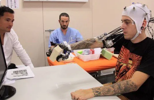 Το νέο σύστημα που δημιουργήθηκε από Ευρωπαίους επιστήμονες, δεν απαιτεί κάποια εμφύτευση στον εγκέφαλο, απλώς ο ασθενής πρέπει να φορέσει μια κάσκα στο κεφάλι του και τον εξωσκελετό στο μπράτσο και το χέρι του. Το σύστημα «διαβάζει» την ηλεκτρική δραστηριότητα του εγκεφάλου και τις κινήσεις των ματιών του ασθενούς και τα «μεταφράζει» σε εντολές προς τον εξωσκελετό, ο οποίος κινεί έτσι το χέρι με τον επιθυμητό τρόπο, σχεδόν αποκαθιστώντας τη φυσιολογική κίνησή του.