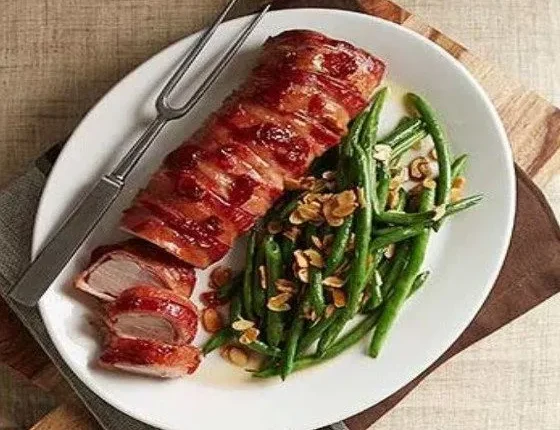 Ζουμερό ρολό από άπαχο χοιρινό και φέτες μπέικον «δεμένα» μαζί με φρέσκα φασολάκια, μέλι και αμύγδαλα και μόλις 28 γραμμάρια υδατανθράκων.