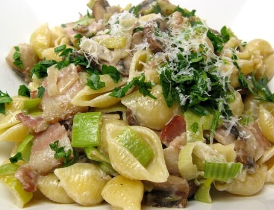 Μπέικον με ζυμαρικά, πράσο και μανιτάρια