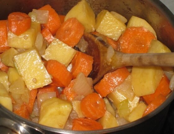* Για τις πατάτες, τα καρότα και τις παστινάκες (γογγύλια που μοιάζουν με καρότα που έχει ξεθωριάασει το χρώμα τους) δυναμώνουμε τη φωτιά και μαγειρεύουμε για 6-7 λεπτά, ανακατεύοντας μέχρι τα λαχανικά να πάρουν ένα χρυσό χρώμα.