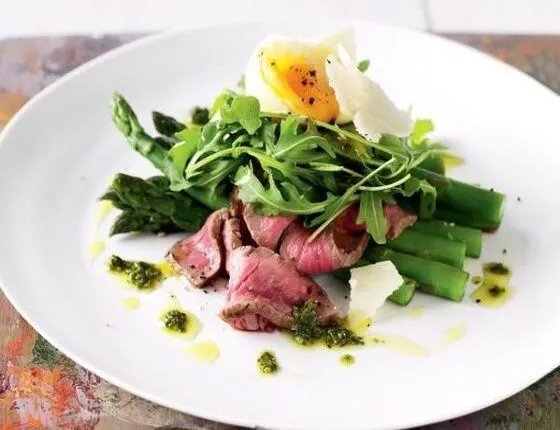 Θέλετε ένα χορταστικό θρεπτικό και υγιεινό γεύμα που θα σας χαρίσει ενέργεια, χάρη στην πλούσια πρωτεΐνη του; Τότε μη διστάσετε να απολαύσετε το συνδυασμό ενός μοσχαρίσιου φιλέτου που συνοδεύεται με σπαράγγια, ρόκα, βραστά αυγά και ντιπάκι από πέστο.