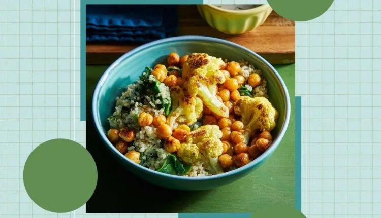 Αυτό το νόστιμο μεσημεριανό γεμάτο φυτικές ίνες ξεκινάει με την ανάμειξη μπουκετών κουνουπιδιού και ρεβιθιών με ελαιόλαδο, σκόνη κάρυ και αλάτι. Ενώ αυτά τα υλικά ψήνονται (και αναπτύσσουν γεύση), μαγειρέψτε λίγη κινόα. Καθώς η κινόα χρειάζεται μόνο περίπου 15 λεπτά για να μαγειρευτεί, είναι έτοιμη μέχρι να ψηθούν πλήρως τα ρεβίθια και το κουνουπίδι. Αφαιρέστε την κινόα από τη φωτιά, στη συνέχεια προσθέστε 4 φλιτζάνια ψιλοκομμένο baby σπανάκι. Το τελευταίο βήμα είναι η προετοιμασία της σάλτσας, η οποία είναι ένα απλό μείγμα από ταχίνι, ξύσμα λάιμ, χυμό λάιμ, σκόρδο και πιπέρι. Ανακατέψτε τα όλα μαζί για ένα νόστιμο, χορταστικό γεύμα.